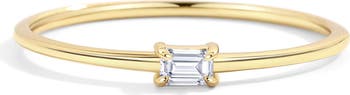 An elegant and simple baguette birthstone is prong-set in a simple band, which is meant to be worn alone or stacked well.