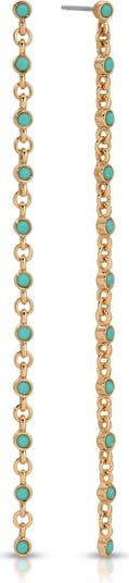 Burnished stones add the perfect pop of color to these dramatic linear drop earrings plated in 18-karat gold.