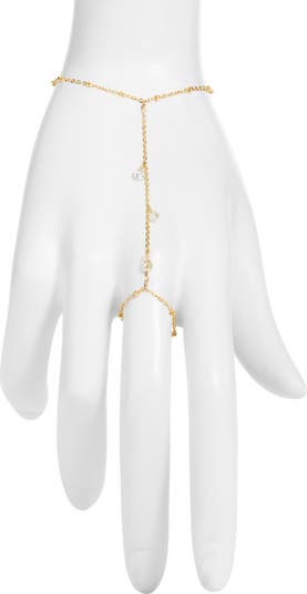Cubic zirconia charms and satellite beads add textured shine to a dainty chain that drapes from wrist to middle finger.