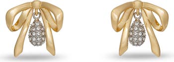 - 14K gold-plated bows featuring dangling pave droplet