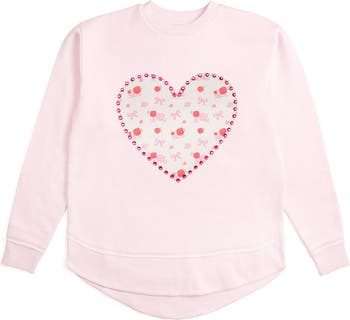 This soft pink sweatshirt adds a touch of sparkle with with pearls and gems and a heart filled with dainty bows and roses— perfect on its own or even sweeter when paired with your little one’s matching version for a darling Mama and Me look!