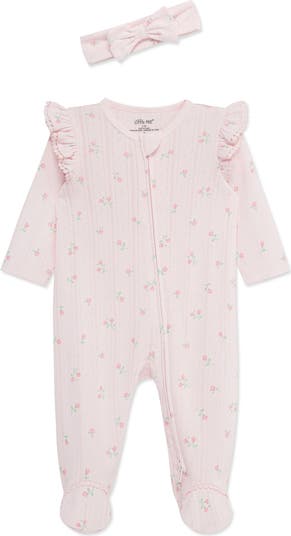 Dainty roses pattern this precious pointelle footie made of supersoft cotton and paired with a matching headband.