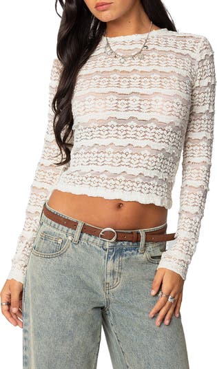 Sugar and spice play oh-so-nice for a cute, cropped top crafted from stretchy lace in a variety of sweet stitches.
