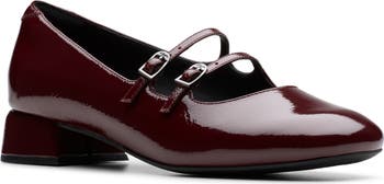 Twin straps give a contemporary look to a round-toe Mary Jane crafted from glossy patent leather and set on a low block heel.