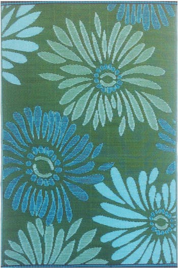 - - 100% recycled polypropylene - UV / fade resistant - water repellent / mold resistant - stain resistant - indoor & outdoor use - debris and sand brushes right off - was with a hose or mop and light detergent