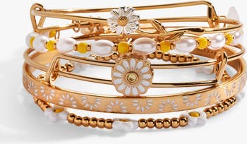 A full bouquet of golden blooms. This all-gold bracelet set celebrates the daisy with 5 unique designs: a painted epoxy daisy charm on a slider inline bangle, a beaded bracelet with daisy flower beads, an open cuff with a delicate daisy pattern, an inline bangle with a mixed-metal silver-petaled daisy, and a beaded bangle featuring a mix of yellow and pearl beads. A dreamy floral stack that radiates sunshine.
