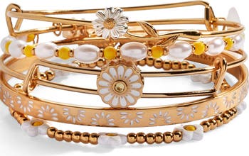 A full bouquet of golden blooms. This all-gold bracelet set celebrates the daisy with 5 unique designs: a painted epoxy daisy charm on a slider inline bangle, a beaded bracelet with daisy flower beads, an open cuff with a delicate daisy pattern, an inline bangle with a mixed-metal silver-petaled daisy, and a beaded bangle featuring a mix of yellow and pearl beads. A dreamy floral stack that radiates sunshine.