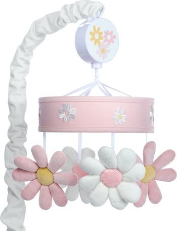 Four soft velour daisies rotate slowly around this charming musical mobile. Two daisies are rose pink with sun-kissed yellow centers and two are soft white with rose pink centers. The decorative ring is a rose pink ground with seven white daisies embroidered all around. A white velour scrunchie covers the mobile arm. This musical mobile plays nursery songs for 20 minutes, has an on/off switch, and volume control. It plays Brahms Lullaby, Twinkle, Twinkle Little Star, and Rock-a-By-Baby. Requires 3 AAA batteries, not included.
