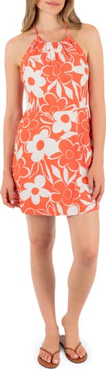 A vibrant retro floral print brings summery charm to this lightweight cotton-blend minidress topped with a cool halter neckline.
