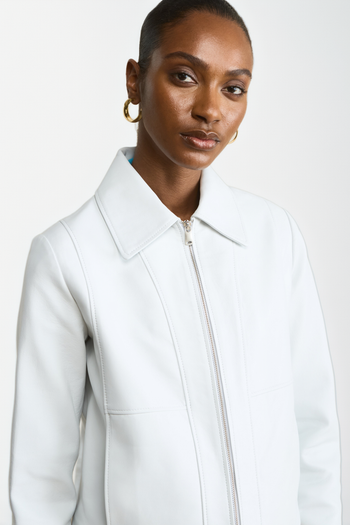 Hand-crafted from premium British leather, this cropped jacket features a structured silhouette, lightweight feel, and timeless details for lasting versatility. Designed with clean lines, a classic collar, and an exposed front zip closure, this leather jacket offers a polished look that transitions effortlessly from day to night. Subtle seaming and a streamlined fit provide a modern edge, while the lightweight construction makes it ideal for layering in changing weather. Durable and luxurious, this piece is crafted to endure season after season. Made in Turkey, imported, and shipped from the USA. Ideal for those seeking a genuine leather jacket with a minimalist design, perfect for pairing with jeans, trousers, or dresses.