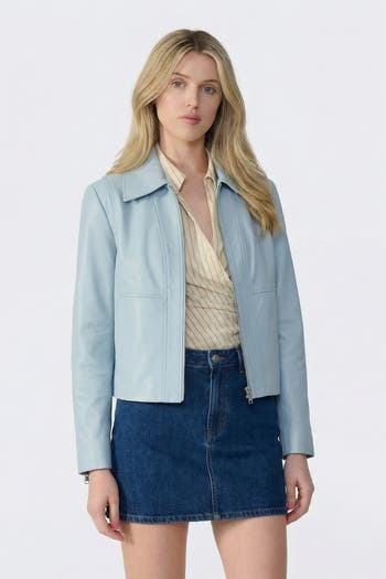Hand-crafted from premium British leather, this cropped jacket features a structured silhouette, lightweight feel, and timeless details for lasting versatility. Designed with clean lines, a classic collar, and an exposed front zip closure, this leather jacket offers a polished look that transitions effortlessly from day to night. Subtle seaming and a streamlined fit provide a modern edge, while the lightweight construction makes it ideal for layering in changing weather. Durable and luxurious, this piece is crafted to endure season after season. Made in Turkey, imported, and shipped from the USA. Ideal for those seeking a genuine leather jacket with a minimalist design, perfect for pairing with jeans, trousers, or dresses.