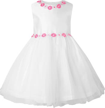 This Pink Daisy Tulle Dress is the perfect choice for any special occasion. With its fitted sleeveless bodice and full gathered skirt, it provides maximum twirls and comfort for your little girl. The bright pink daisies trimming along the neckline and waist add a pop of colour to the elegant ivory dress. Complete with an invisible zip closure for a sleek finish, this dress is a must-have for birthday parties and flower girls.