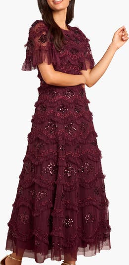 The Daisy Wave Ankle Gown. Channeling organic texture with bold femininity this gown is adorned with undulating daisy sequin motifs, and tulle layers that move with softness and sparkle. Perfect for a romantic twist on evening dressing.