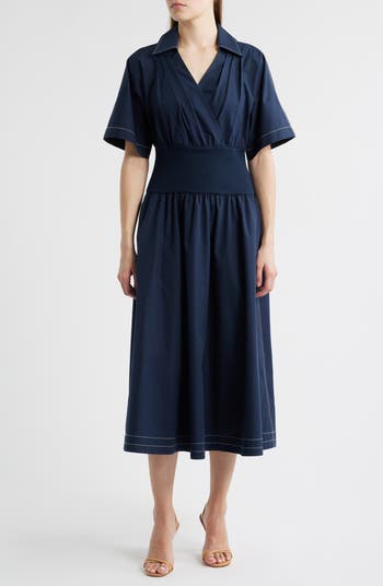 Contrast stitching accentuates the classic A-line silhouette of this woven cotton dress.