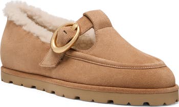 Genuine shearling lining warms the interior of this luxe suede Mary Jane flat cushioned with an EVA footbed for comfy, flexible support.