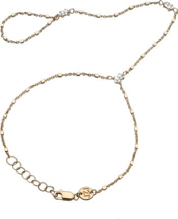 Pear-shaped sapphires sparkle from wrist to finger on this delicate geometric hand chain plated in warm 18-karat gold.