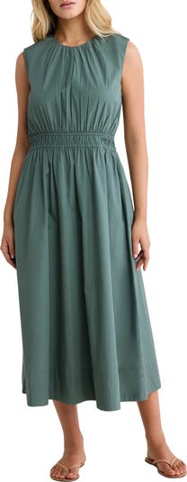 Waistline smocking sweetens the silhouette of this sleeveless flared maxi cut from crisp poplin.