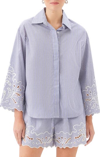Floral embroidery and scalloped cuffs add a touch of vintage charm to this woven cotton shirt patterned in crisp stripes.