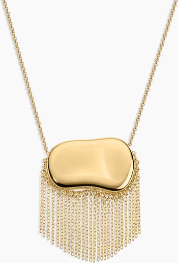 This bold gold pendant is finished with playful fringe and shimmies with every step. Catch light (and attention) everywhere you go.