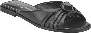 An organically-shaped stone embellishment centers the gathered straps on a minimalist slide sandal perfect for your warm-weather looks.