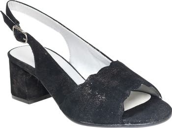 Scalloped edges and a shimmerstruck finish bring bold modern glamour to this slingback sandal grounded by comfort-enhancing memory foam cushioning.