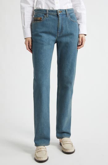 Classic straight-leg jeans cut from heavyweight stretch denim are given a signature touch with a coin pocket printed with Burberry Check and a suede label is back embossed with the Equestrian Knight Design.