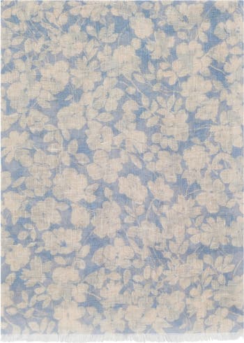 Sumptuously soft linen scarf, delicate floral weave, breathes lightly for sunlit days, drapes beautifully to complete daytime looks.