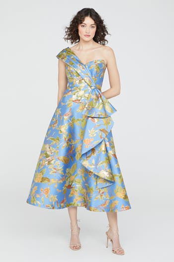The Dalia Dress showcases an exclusive nature-inspired jacquard in a vibrant sky blue and gold palette. A sculpted one-shoulder bodice and cascading ruffle detail add elegance to its modern silhouette. A designer favorite, this piece encapsulates artistry.