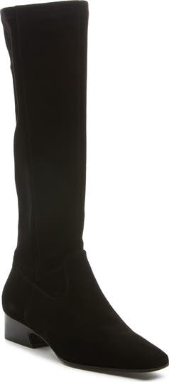 A blocky, subtle heel puts enhanced stability underfoot in a weatherproof boot styled smartly with a with a knee-high shaft and a softly squared toe.