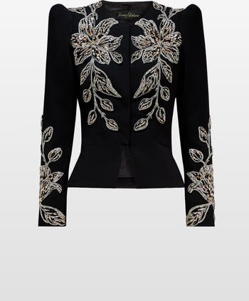 Exude confident sophistication in this tailored jacket, a perfect blend of sharp structure and intricate embellishment. The design features a flattering fitted silhouette with softly padded shoulders and a peplum waist that enhances the figure. Sparkling floral beadwork cascades across the bodice and sleeves, creating a striking, light-catching effect that elevates any ensemble. Designed for occasions where polished elegance meets bold, statement-making style.
