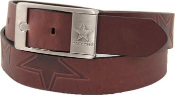 You're a devoted Cowboys fan, but face paint and gaudy team accessories just aren't your cup of tea. Up your Dallas ante without the garish embellishments when you sport the Brandish leather belt. Featuring debossed team graphics repeated around the belt and an engraved team logo on the metal buckle, this adjustable belt has tons of Cowboys spirit that will never interfere with your polished personal style. This is Dallas fanaticism that you can show off regardless of the occasion!