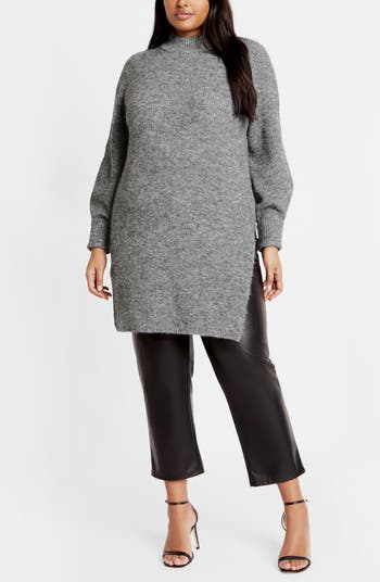 A longline silhouette provides extra warmth to this mock-neck sweater shaped by soft ribbing and finished with a slit at the hem that creates an asymmetric look.