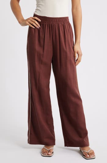 These cotton-linen pants run optic-white side rails and lean into lounge energy with a gentle elastic waist.