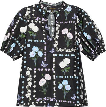 Crisp cotton brings fresh structure to this floral split-neck top, while pretty puff sleeves sweeten the silhouette with graceful charm.