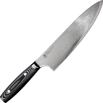 Chef’s Knife Prince of Scots Damascus knives reflect the craftsmanship of a centuries-old tradition of Japanese knife making merged with American Design and Engineering. The fusion of Eastern and Western knifemaking philosophies feature increased knuckle clearance for home kitchen use. The knives feature thin razor-sharp edges perfect for slicing, dicing, and chopping a full range of fruits, vegetables, meat, and other foods. Our ergonomic G10 Handle paired with thinner, lighter blades makes this knife collection less tiring to use and optimized for cooking and eating together. All knives are handcrafted with 67 layers of Japanese AUS10 Damascus Steel which merge the metal into a single blade forming our beautiful bead-blasted Auspicious Pattern. 8.5 Inch Damascus Chef’s Knife made with Japanese AUS10 Steel. All-purpose blade for a full range of cutting tasks with curved blade for easy cuts Razor-sharp thin edge of blade is perfect for slicing, dicing, and chopping a full range of fruits, vegetables, meat, and other foods; thinner, lighter blade makes this knife less tiring to use Durable G10 Handle rests comfortably in any hand and resist moisture. These handles have a slight ridge on the right side, which fits into the curl of the fingers for a comfortable and secure grip Through Tang Construction provides perfect balance Mirror Polished 67 Layer Steel Auspicious Pattern Blade Rounded Spine for comfort of pinch grips Each Handle Features Prince of Scots Luckenbooth Logo Stamp Premium Gift Box Each knife is presented in luxury packaging How to