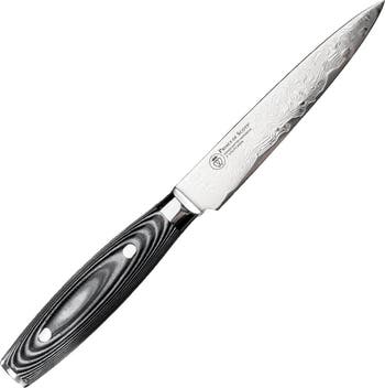 Utility Knife Prince of Scots Damascus knives reflect the craftsmanship of a centuries-old tradition of Japanese knife making merged with American Design and Engineering. The fusion of Eastern and Western knifemaking philosophies feature increased knuckle clearance for home kitchen use. The knives feature thin razor-sharp edges perfect for slicing, dicing, and chopping a full range of fruits, vegetables, meat, and other foods. Our ergonomic G10 Handle paired with thinner, lighter blades makes this knife collection less tiring to use and optimized for cooking and eating together All knives are handcrafted with 67 layers of Japanese AUS10 Damascus Steel which merge the metal into a single blade forming our beautiful bead-blasted Auspicious Pattern. 5 Inch Damascus Utility Knife made with Japanese AUS10 Steel All-purpose blade A must-have tool for every kitchen. Between a chef’s knife and a paring knife in size, the Utility Knife has a narrower and straighter blade, affording power and precision when cutting a variety of ingredients. Razor-sharp thin edge of blade is perfect for slicing, dicing, and chopping a full range of fruits, vegetables, meat, and other foods; thinner, lighter blade makes this knife less tiring to use Durable G10 Handle rests comfortably in any hand and resist moisture. These handles have a slight ridge on the right side, which fits into the curl of the fingers for a comfortable and secure grip Through-Full Tang Construction provides perfect knife balance Mirror Polished 67 Layer Steel Auspicious Pattern Blade Each Handle Features Prince of Scots Luckenbooth Logo Stamp Premium Gift Box Each knife is presented in luxury packaging