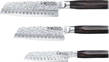 The Cuisine::pro® Damashiro EMPEROR® 3-piece Santoku Set rounds out any knife collection with three essential sizes of Santokus, guaranteed to deliver you the best agile chopping experience for all food types. The santoku's low tip and broad blade makes it a cook’s best friend for slicing, dicing and mincing. Recessed scallops along the blade reduce friction and help release thin slices and sticky ingredients with ease.
