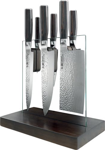 The ideal upgrade for any high-end kitchen, the Cuisine::pro® Damashiro EMPEROR® 7-piece Hikari knife block features a full range of premium knives, each artfully arranged on a tempered glass display fitted with elegant pakkawood magnets to securely hold your knives.