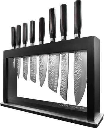 - 9-PIECE KNIFE BLOCK INCLUDES: 8" chef’s knife, 8" bread knife, 6.5” santoku, 6" chef’s knife, 5.5” santoku, 5” santoku, 4.5" utility knife, 3.5" paring knife, housed in a stylish block that showcases your blades.