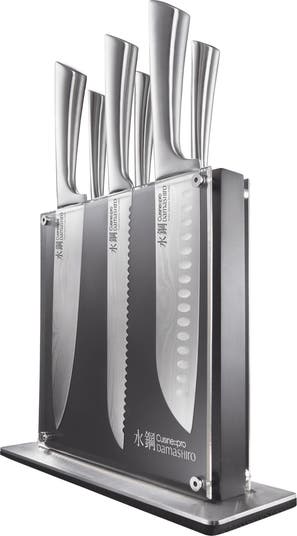 The CUISINE::PRO® Damashiro® Kin 7-Piece Knife Block features 6 essential Japanese steel knives in a stylish knife block that showcases your blades and protects the sharpness of your knives.