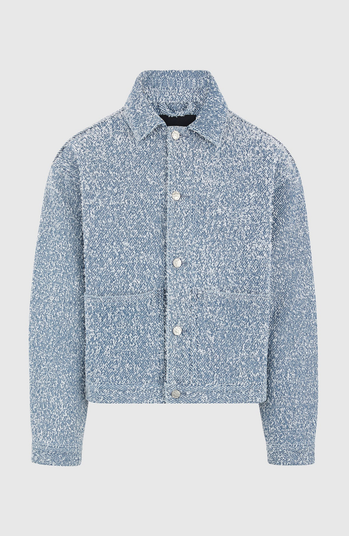 - Bouclé Texture for Visual and Tactile Depth Back Pleat Adds Fluidity to Cropped Structure Angled Front Welt Pockets for Function Cropped Cut with Clean Hemline Button Placket and Cuff Fastening Manière De Voir Eiffel Debossed Leather Branding