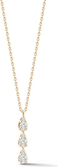 Three settings holding two diamonds each cascade down from a 14-karat gold chain in this shimmering pendant necklace.