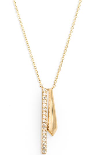 A delicate necklace centered by a pair of linear pendants and twinkling diamonds adds understated polish to your look.
