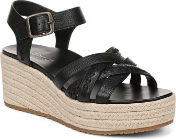 Decorative stitching details the leather straps woven atop a stylish sandal lofted by a jute-wrapped platform wedge.