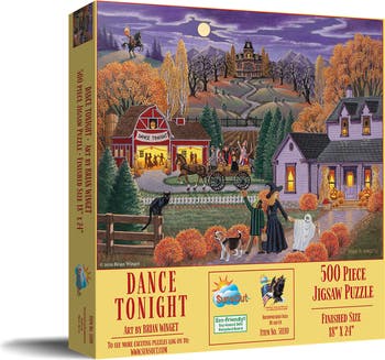 Embark on an intriguing journey with SunsOut's Dance Tonight 500 Piece Jigsaw Puzzle, designed with mesmerizing artwork by Brian Winget. Immersing you into a whimsical world of lively Halloween festivities, the 18" x 24" puzzle offers adults an enchanting experience under a moonlit sky. SunsOut Puzzles, made with pride in the USA, ensure high-quality craftsmanship using recycled cardboard, which interlocks securely for a pleasurable assembly process, reflecting the company's commitment to superior standards and customer satisfaction. By using soy-based inks and eco-friendly recycled-boards specifically made for jigsaw puzzles, SunsOut supports sustainable manufacturing. The artwork for the puzzle licensed from top artists captures wonderful stories and vignettes. The Dance Tonight puzzle, with its holiday-themed design, makes an ideal gift for holiday fanatics, animal lovers, or simply those fond of nostalgia, providing a fun activity to piece together for display. As a product from a proudly woman-owned business, purchasing this puzzle not only brings joy to your life but also promotes women's empowerment and entrepreneurship. SunsOut places a strong emphasis on quality, creativity, and corporate social responsibility, ensuring every piece is crafted with care and dedication.