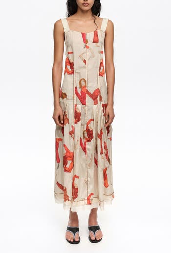 Fitted midi dress made from a soft lyocell-blend fabric, finished with a frilled hem. Designed with a square neckline and elasticated straps, a back metal zip fastening, patch pockets at the hip, and all-over contrast zigzag