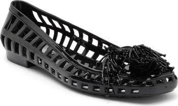 A jelly-like upper lends throwback appeal to a darling flat topped with beaded fringe that swishes and sways with your every stride.