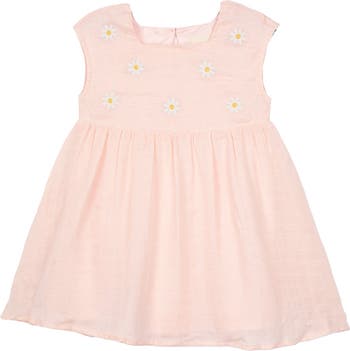 - This charming girl's dress in a soft blush pink hue is crafted from a breathable fabric for all-day comfort. It features delicate embroidered daisies on the bodice, adding a whimsical touch. The dress is designed with a flowy silhouette and a back button closure for easy dressing, making it perfect for any occasion. Fabric Care 100% COTTON / 100% POLYESTER Machine Wash Cold