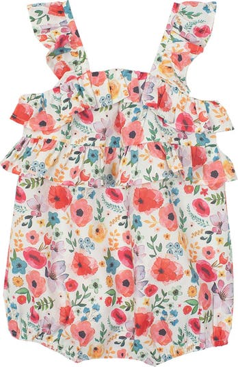 This baby romper features a colorful floral print in shades of pink, red, purple, and green on a lightweight chiffon fabric. It has delicate ruffled shoulder straps and a double-tiered ruffle bodice, perfect for a special occasion. Fabric Care 100% POLYESTER Machine Wash Cold | Line Dry Do Not Bleach