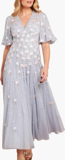 The Dandelion Ditsy Ankle Gown. Showcases soft floral embroidery that gently fades toward the hem. Crafted from layers of fine tulle, this gown radiates lightness and romantic sophistication. A timeless evening statement.